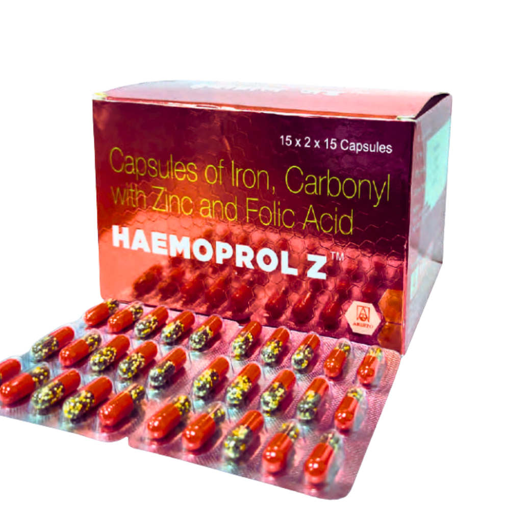 Haemoprol Z is a health supplement containing Carbonyl Iron, Zinc, and Folic Acid – ideal for treating and preventing iron deficiency anemia, fatigue, and low hemoglobin.