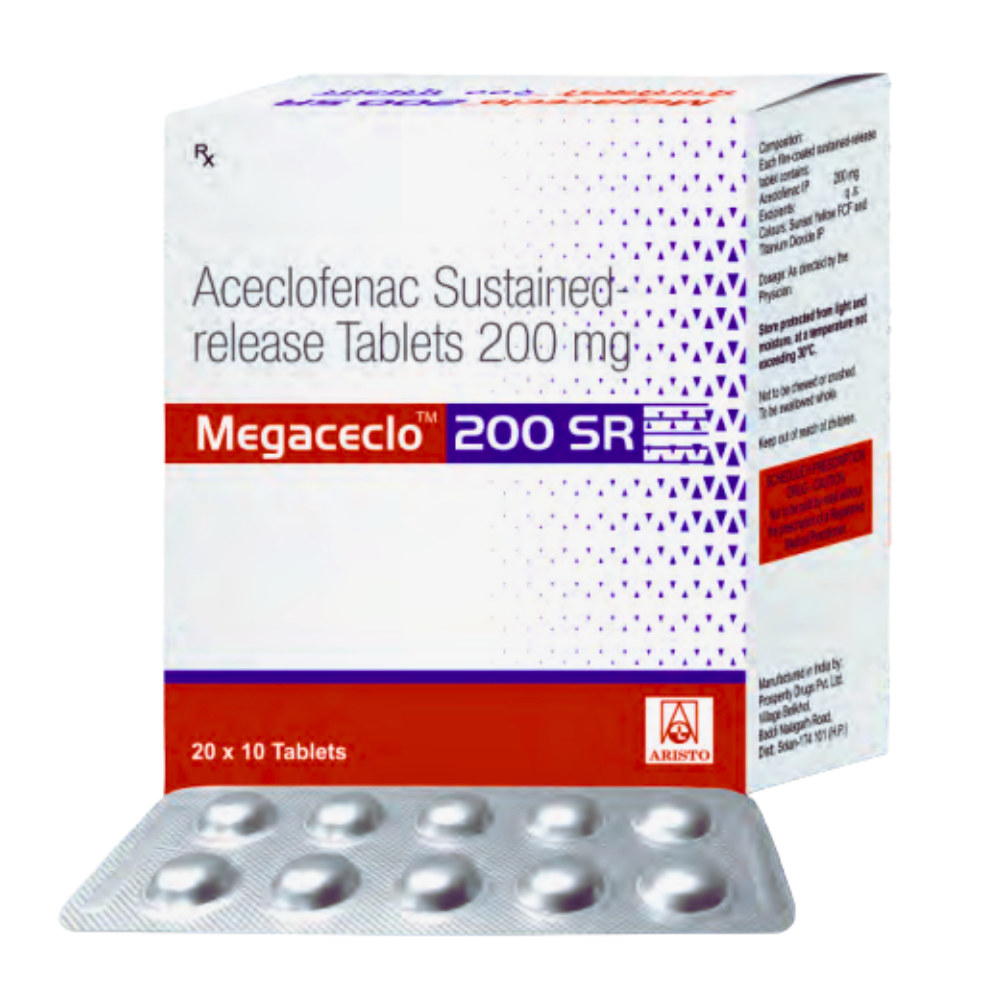 Megaceclo 200 SR by Aristo Pharmaceuticals provides Aceclofenac 200 mg in a sustained-release form for prolonged pain relief and reduction of inflammation, commonly used in arthritis, joint pain, and musculoskeletal conditions.