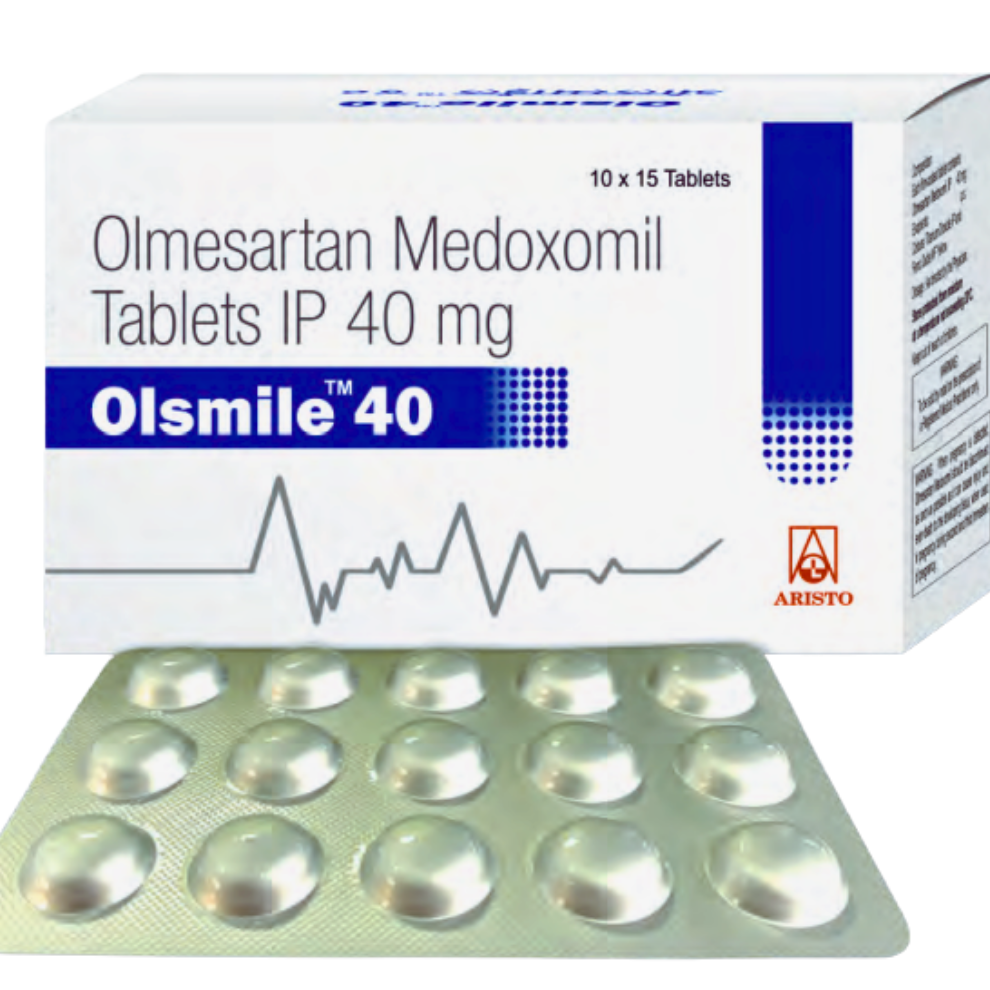 Olsmile 40 is an effective antihypertensive tablet containing Olmesartan Medoxomil IP 40 mg, an angiotensin II receptor blocker (ARB) that helps relax blood vessels and lower high blood pressure. It is ideal for long-term management of hypertension and helps reduce the risk of stroke and heart attack.